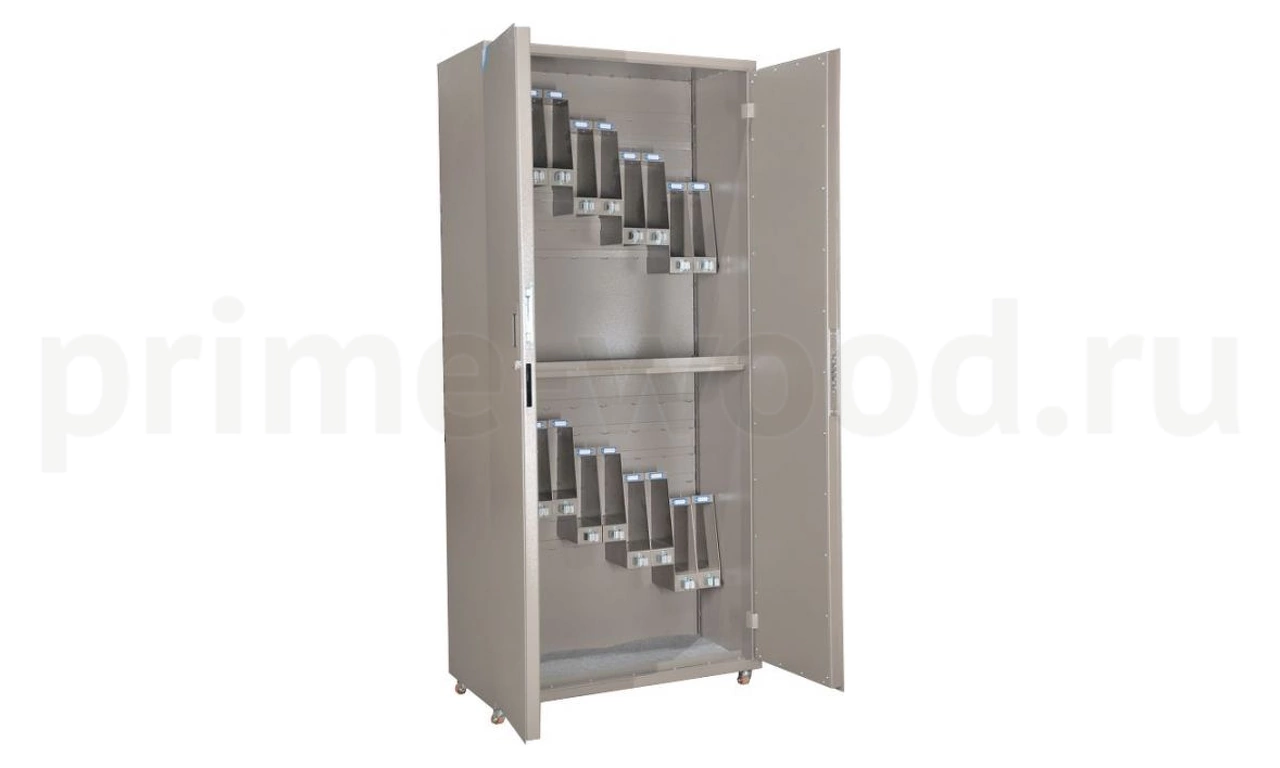 Сейф оружейный на 20 стволов. Высота ствола от 360 до 680 мм. Ложементы — металлические держатели с резиновыми роликами. На двери установлена рамка под опись.
