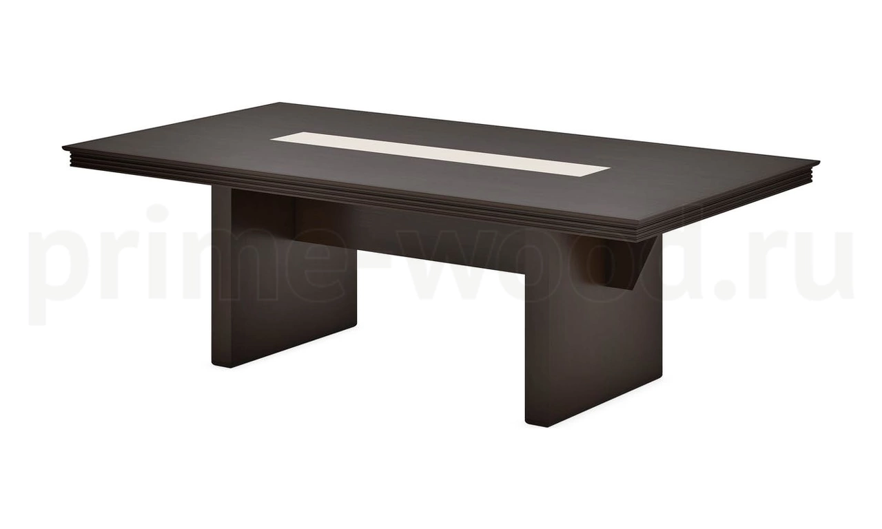 Большой переговорный стол позволит разместить до 10 человек одновременно. При этом каждый будет чувствовать себя комфортно. Центральная часть столешницы также инкрустирована натуральной кожей цвета слоновой кости. Опоры выполнены из тамбурата толщиной 90 мм с завершающими декоративными панелями из массива дерева толщиной 19 мм с закруглением радиусом 15 мм.